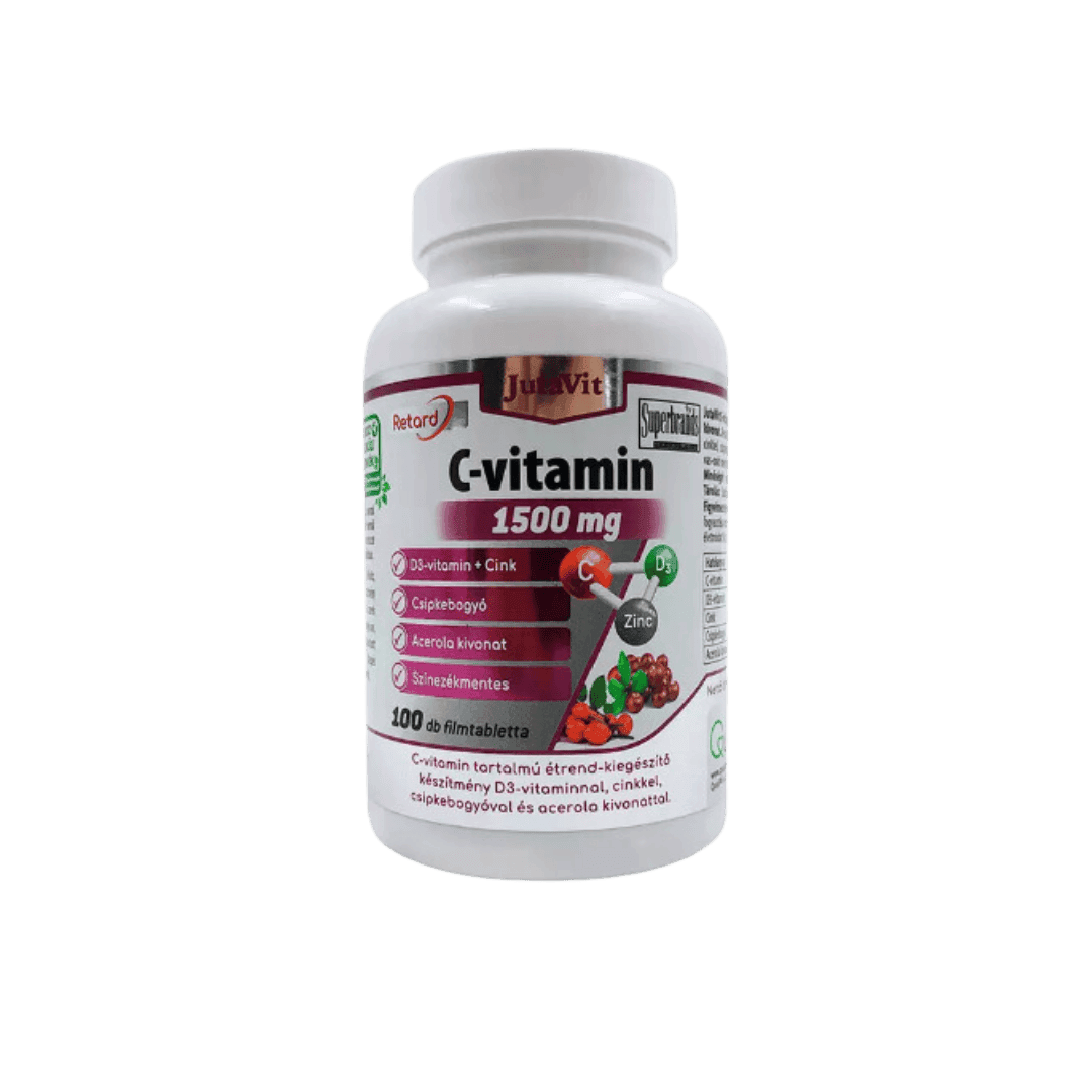 JutaVit Vitamin C 1500 mg + D3 + Cink sadrži 1500 mg vitamina C sa produženim oslobađanjem, uz vitamin D3, cink, acerolu i ekstrakt šipka, koji postepeno dodaju vitamin C našem telu. Vitamin C, vitamin D3 i cink doprinose normalnom funkcionisanju imunog sistema. Vitamin C takođe doprinosi smanjenju umora i iscrpljenosti, zaštiti ćelija od oksidativnog stresa, održavanju normalne psihološke funkcije i normalnom funkcionisanju nervnog sistema. Poboljšava apsorpciju gvožđa i doprinosi pravilnom formiranju kolagena, čime pomaže u održavanju normalnog stanja krvnih sudova, kože, zuba, desni, hrskavice i kostiju. Vitamin D3 doprinosi normalnoj apsorpciji/iskorišćenju kalcijuma i fosfora, održava nivo kalcijuma u krvi, zdravlje kostiju, funkciju mišića i normalne zube, a takođe igra ulogu u deobi ćelija.